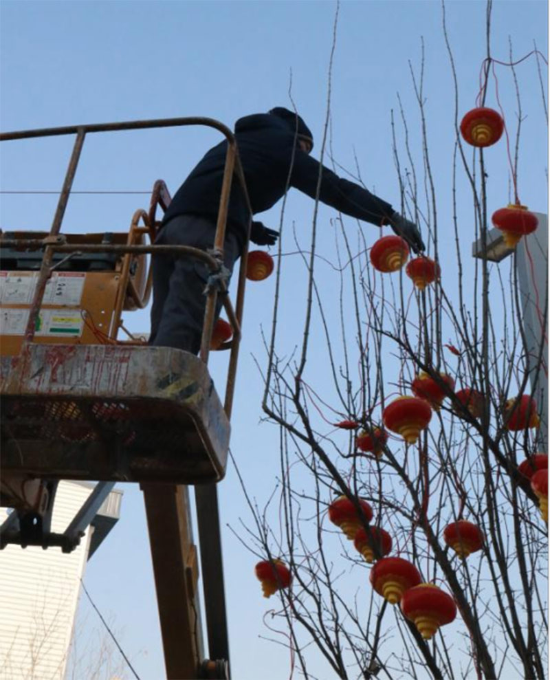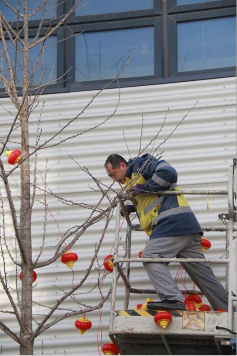 為給園區(qū)營造濃厚的節(jié)日氣氛,給入駐企業(yè)帶來如家般的溫情呵護,沈陽航發(fā)展運營管理有限公司物業(yè)團隊,在零下二十度的氣溫下,凍紅了雙手,冰覆了睫毛,但他們依然堅守,扶梯的扶梯、攀爬的攀爬,將火紅的燈籠掛在園區(qū)主干道、企業(yè)門前。滿街的火紅,是他們對園區(qū)的熱愛,也是對工作的執(zhí)著,更是對崗位責(zé)任的滿滿執(zhí)念。園區(qū)的燈亮了,客戶們洋溢的笑臉,映襯著角落里一道道靚麗的風(fēng)景線,夜幕降臨下,五彩斑斕的彩色燈光給園區(qū)增添了不少喜慶的色彩,也深深的印在了師傅們熱切的心里。